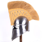 Among the finest headgear of ancient Greece comes this attractive Spartan Helmet with Tan Plume. The Spartans were known as fierce fighters and their army stood strong as a central military presence in the city of Sparta. Featuring 18 gauge steel construction, this piece is distinguished by a simulated horsehair plume with a leather plume holder and comes fuly wearable. With authentic style, this helmet is great for costumes, collections, and reenactments.