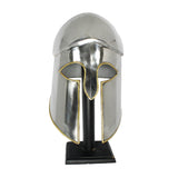 Steel Greek Corinthian Helmet With Brass Trim Wearable Armor Costume Length: 9.5" Width: 9.25" Height: 14" A hand tooled handcrafted Greek armor helmet made of steel with brass trim. It has been designed in traditional international style. The Corinthian style helmet favored by ancient Greeks enjoyed a long period of use, from the early 7th to the 4th Century B.C. This simple yet elegant design helmet could be pushed back to rest on the head when not in use, allowing view of the face and is portrayed in many Greek works of art. Our epic reproduction is handcrafted in 18 gauge steel and dates between 600-550 BC. Add a touch of history into your life with this impressive helmet.