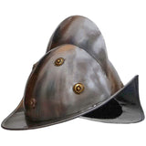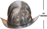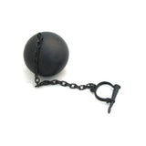 This ball and chain is made of iron with an antique finish. The ball is about 8" in diameter and is attached to a long chain. The chain is about 26" long with a 3.5" wide shackle at the end. When stretched out completely, the ball and chain are about 37" long. This ball and chain is a great wedding or anniversary gag gift. It is also a unique addition to a medieval or pirate costume collection.