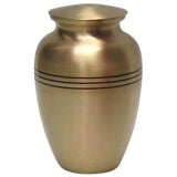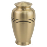 The three bands Brass Urn is a simple and elegant cremation urn for ashes. Three engraved black bands contrast beautifully against brushed brass finish. The Three Bands Brass Urn is a popular choice due to its elegant and understated design. This cremation urn is an appropriate choice for honoring a loved one in a dignified and meaningful way.