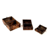 The nested pirate treasure chests are handcrafted of solid wood. The side banding and hasps are solid metal. The top of the keepsake storage boxes is decorated with metal straps and studs that give the trunks a pirate treasure chest look. The chests have an antiqued distressed brown finish (finish and minor blemishes may be varied).