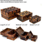 Set of three 8", 6" and 4" new traditional rustic wood and iron medallion boxes with lids, mahogany-finish mango wood with exposed grain, distressed-finish black iron strips crisscrossed on lid, vertical strips with horizontal rim and base frame on box, raised black iron medallions between strips with exposed nails, silver-finish iron knob lid handle. This product is manufactured in India.