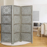 A beautiful 3-panel hand carved wooden screen room divider with stunning intricate floral design.