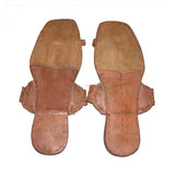 A pair of genuine leather sandals hand made from water buffalo leather. These sandals are also called "Hippie" or "Jesus" sandals that were popular during the 60's and 70's and are still popular now. They would be great for Renaissance, Indian War, Mountain Man/Fur Trade, or just doing normal daily things. Sandals are completely flat on the bottom, with no raised heel. In natural or dark Brown. Actual color may vary due to the leather used. Also, as these are made from genuine leather, there may be scuffs, nicks or rub marks on the sandals. This is normal and are marks in the actual hide. Handmade in India.