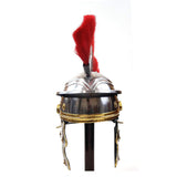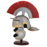 Roman Centurion Helmet with Red PlumeThis historical replica adds a new level to your Easter Play or your European History display. The Centurion was a professional soldier that commanded 100 men. The majority of the Roman Legions' command fell to the Centurions. It is fully wearable and fits most head sizes up to 7 5/8. Also makes a great display conversation piece. This high-quality armor piece features: 18 gauge polished steel Cheek guards Simulated horse hair red plume 16 inches tall Weight 2 lbs