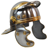 The Roman Guard helmet is similar to our Roman Tropper helmet except it contains more brass accents. This helmet would be worn by standard troopers and legionnaires on the battlefield. It is made out of 18 gauge steel and features real brass accents. The helmet is fully wearable and is perfect for costumes, plays, and collection.