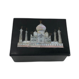 This gorgeous inlaid soapstone box includes a detailed depiction of the Taj Mahal and a sleek black finish. It is artisan crafted, handsome and sturdy. The Taj Mahal is one of the most widely recognized mausoleums of the world. Construction began in 1632, by Emperor Shah Jahan for his third wife. This lovely box is of black soapstone and inlaid with mother of pearl to mimic the white marble of the building and complex itself.