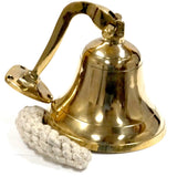 This nautical solid brass ship bell has a diameter of approximately 4" tall and is 4" wide. The brass antique finish brass nautical ship bell includes a hand knotted lanyard and a wall bracket for mounting to any surface. This solid cast brass ship bell is 100% handmade. This bell is sure to be heard through out your home or office!