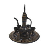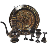 This Etched Brass Wine Set containing a pitcher, six cups and a round tray. Of petite proportions, this set features a masterful etched decoration creating a black and gold patina.