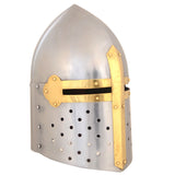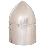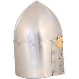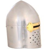 Among the finest in headgear of the Middle Ages comes the Sugar Loaf Medieval Helmet, which was commonly worn on the battlefield during this era. This style was in line with the family of great helms and is characterized by a conical top. Featuring 18 gauge steel construction, this attractive piece is beautifully designed and adorned with rich brass fittings and has ventilation holes around the mouth for breathing room, making it comfortable and fully wearable. With authentic style, this helmet is perfect for costumes, collections, and reenactments.